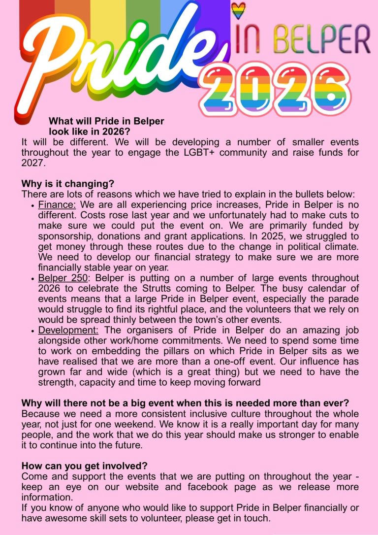Belper is a town known for its community spirit and commitment to inclusion. In response to the UK Supreme Court ruling on the legal definition of a woman—a decision that’s caused deep hurt and fear for many Trans and non-binary people—Pride in Belper is taking action.